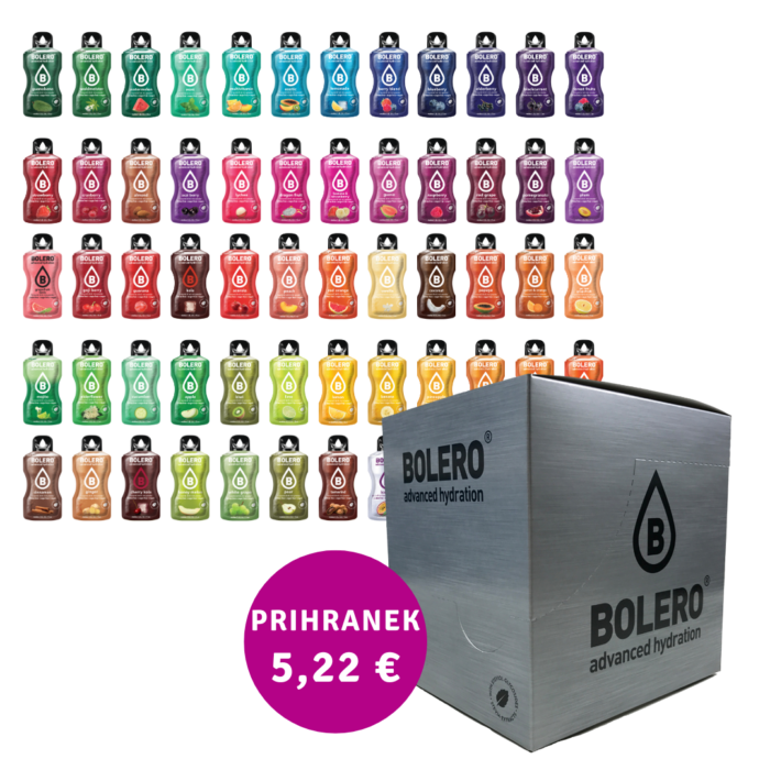 “BOLERO MIX 58 OKUSOV” vsebuje 55 Classic vrečk po 9 gramov za pripravo od 1,5 l do 3 l napitka (odvisno od vaše želje glede intenzivnosti okusa) in 3 Ice Tea vrečke po 8 gramov za pripravo od 1,5 l do 3 l napitka (odvisno od vaše želje glede intenzivnosti okusa). Celoten paket zadostuje za pripravo od 87 l do 174 l napitka, odvisno od želene intenzivnosti okusa.